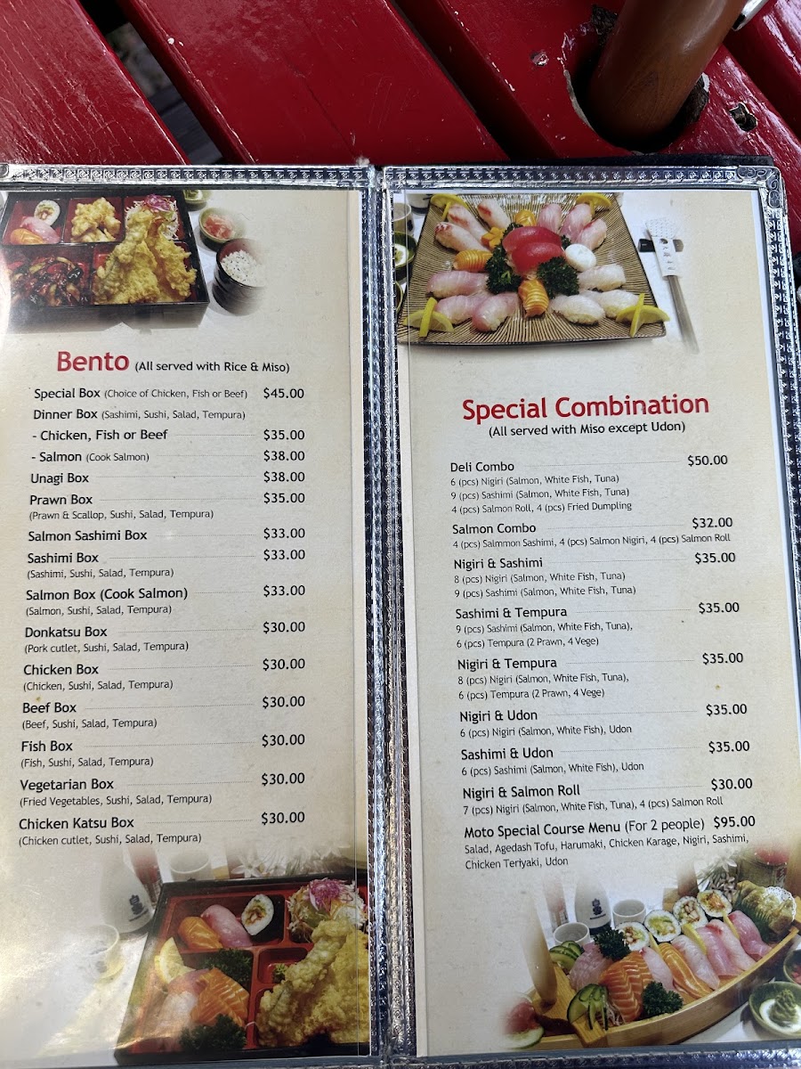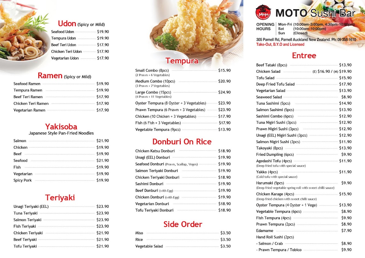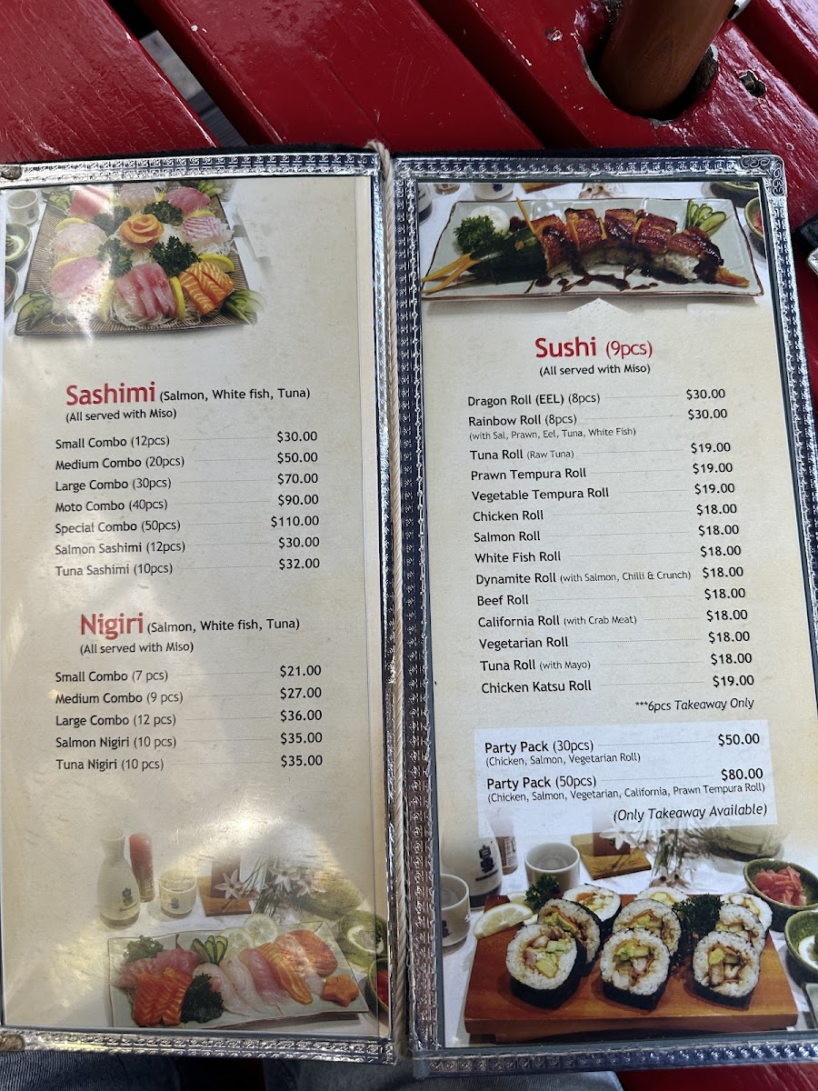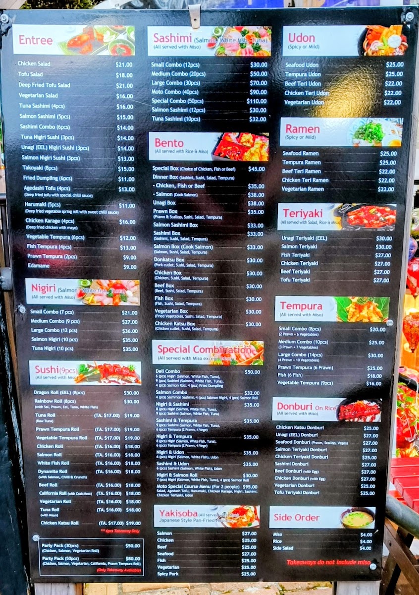 From a reviewer's perspective, the menu at Moto Sushi Bar on 305 Parnell Road offers an impressively broad selection that caters to a variety of tastes. Starters like Chicken Salad, Tofu Salad, Deep Fried Tofu Salad, and Vegetarian Salad set a fresh tone, while Tuna Sashimi offers a delicate seafood option. Sashimi lovers can choose from the Small Combo, Medium Combo, Large Combo, Moto Combo, or the Special Combo, each thoughtfully curated. Noodle enthusiasts will find comfort in Seafood Udon, Tempura Udon, Beef Teri Udon, Chicken Teri Udon, and Vegetarian Udon, while the bento boxes such as the Special Box, Salmon, Unagi Box, Prawn Box, and Salmon Sashimi Box provide convenient yet satisfying meals. Teriyaki options are equally varied, featuring Unagi Teriyaki, Salmon Teriyaki, Fish Teriyaki, Chicken Teriyaki, and Beef Teriyaki, complemented by a range of nigiri including Salmon Nigiri and Tuna Nigiri. The tempura section-with Medium Combo, Large Combo, Prawn Tempura, Fish, and Vegetable Tempura-pairs well with the special combinations like Deli Combo, Salmon Combo, Nigiri & Sashimi, Sashimi & Tempura, and Nigiri & Tempura. Sushi rolls such as Dragon Roll, Rainbow Roll, Tuna Roll, Prawn Tempura Roll, and Vegetable Tempura Roll demonstrate both creativity and classic flavors. Donburi and yakisoba selections-like Chicken Katsu Donburi, Salmon Yakisoba, and Beef Yakisoba-add heartier choices, while sides such as Rice and Side Salad round out the menu. Ramen offerings include Seafood Ramen, Tempura Ramen, Beef Teri Ramen, Chicken Teri Ramen, and Vegetarian Ramen, ideal for warming up on a cool evening. Beverage options are equally extensive, featuring Shochikubai Mio, Japanese beers like Sapporo, Asahi, Kirin, and Sapporo Can Beer, international beers such as Heineken and Light Ice, and a variety of soft drinks, juices, and wines including Corbans Homestead Pinot Gris, Corbans Private Bin Hawke's Bay Pinot Gris, Plum Wine, and Lindauer Fraise. Overall, the menu balances traditional Japanese staples with modern twists, offering something for every palate while maintaining quality and variety.