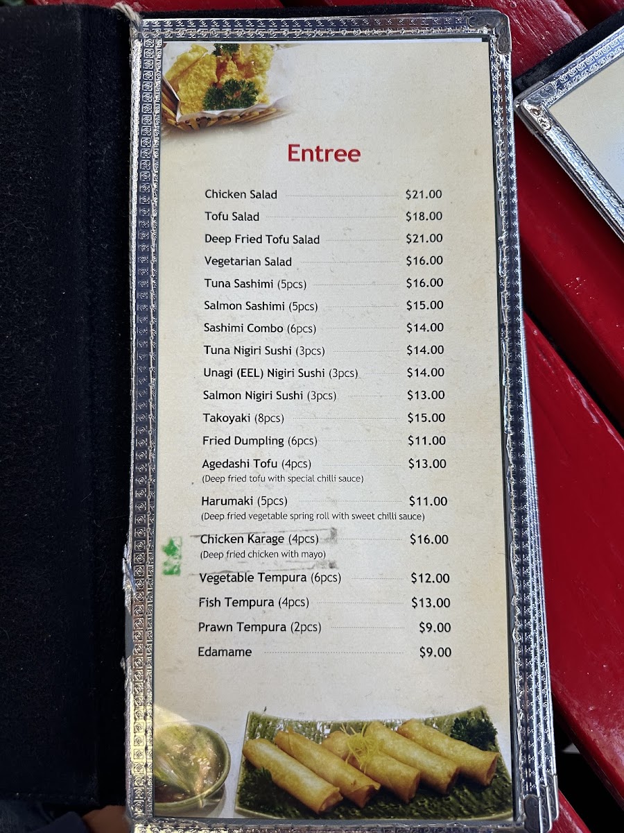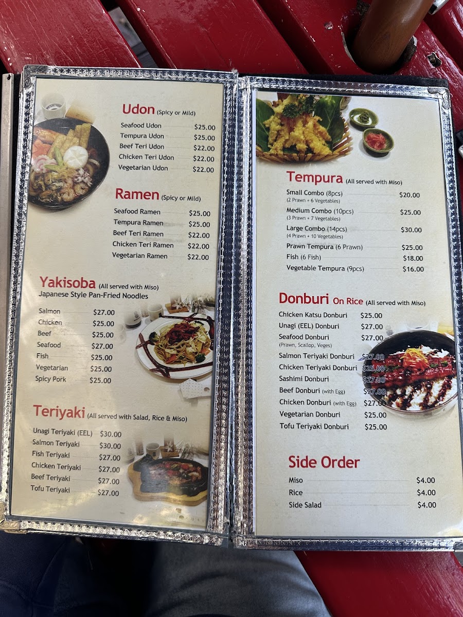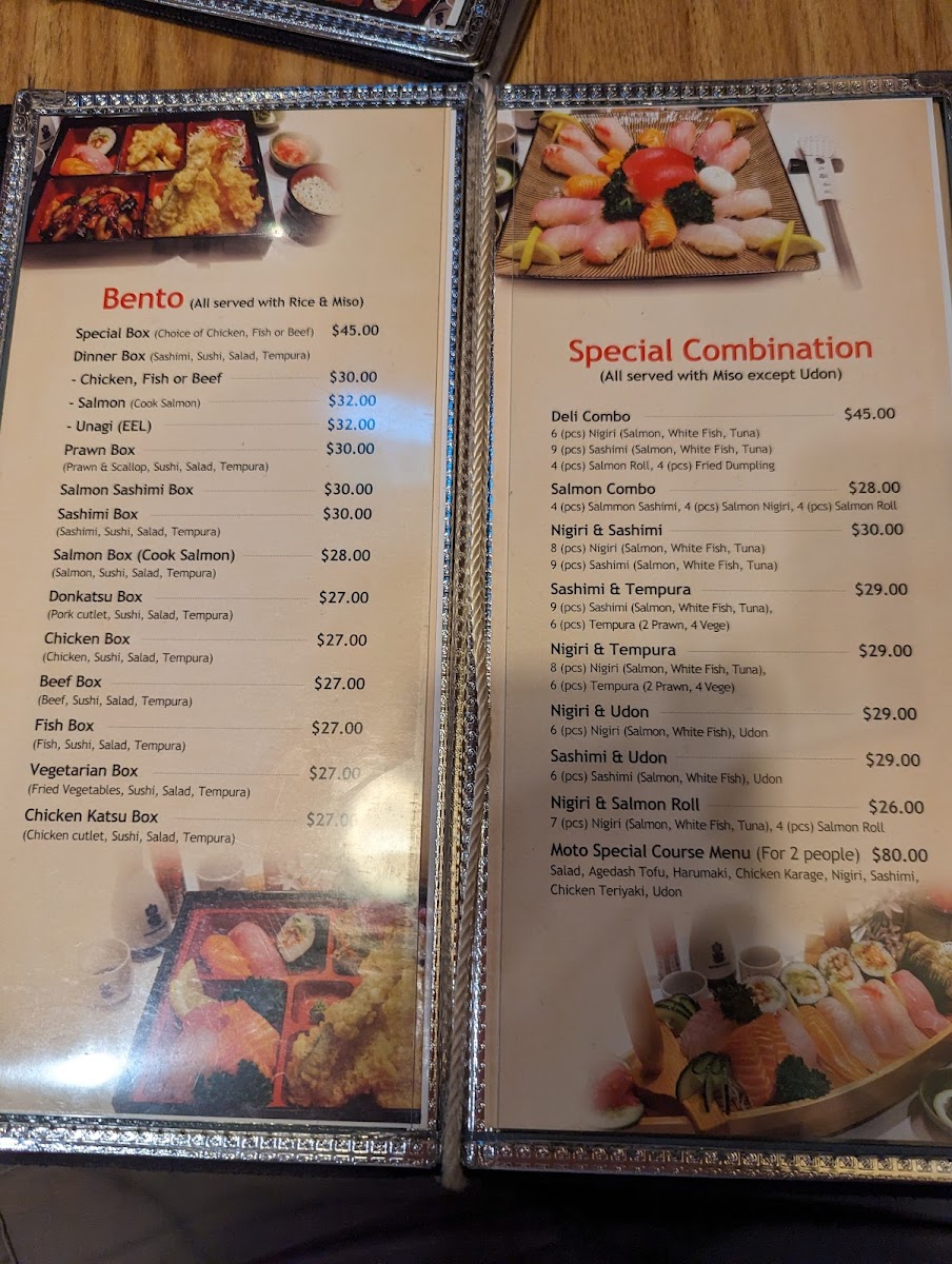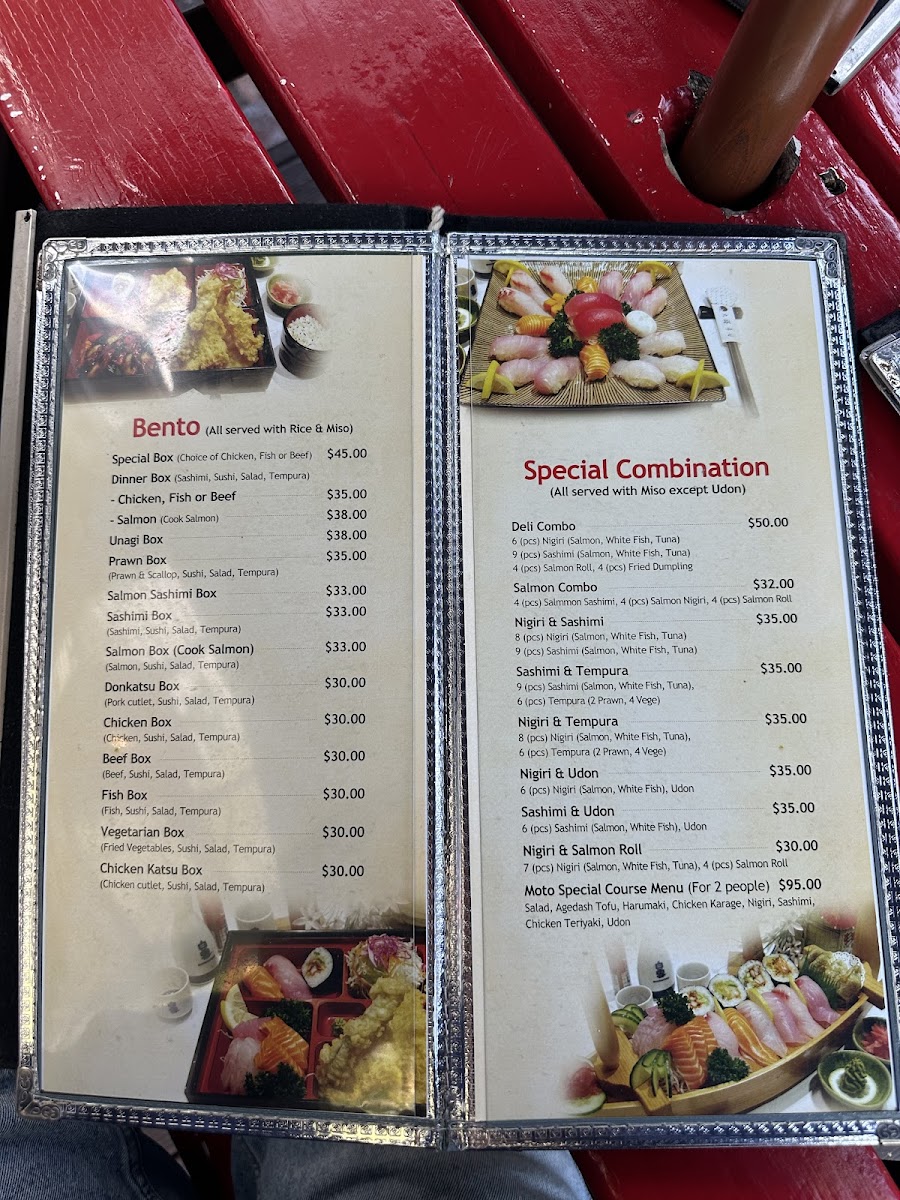 From a reviewer's perspective, the menu at Moto Sushi Bar on 305 Parnell Road offers an impressively broad selection that caters to a variety of tastes. Starters like Chicken Salad, Tofu Salad, Deep Fried Tofu Salad, and Vegetarian Salad set a fresh tone, while Tuna Sashimi offers a delicate seafood option. Sashimi lovers can choose from the Small Combo, Medium Combo, Large Combo, Moto Combo, or the Special Combo, each thoughtfully curated. Noodle enthusiasts will find comfort in Seafood Udon, Tempura Udon, Beef Teri Udon, Chicken Teri Udon, and Vegetarian Udon, while the bento boxes such as the Special Box, Salmon, Unagi Box, Prawn Box, and Salmon Sashimi Box provide convenient yet satisfying meals. Teriyaki options are equally varied, featuring Unagi Teriyaki, Salmon Teriyaki, Fish Teriyaki, Chicken Teriyaki, and Beef Teriyaki, complemented by a range of nigiri including Salmon Nigiri and Tuna Nigiri. The tempura section-with Medium Combo, Large Combo, Prawn Tempura, Fish, and Vegetable Tempura-pairs well with the special combinations like Deli Combo, Salmon Combo, Nigiri & Sashimi, Sashimi & Tempura, and Nigiri & Tempura. Sushi rolls such as Dragon Roll, Rainbow Roll, Tuna Roll, Prawn Tempura Roll, and Vegetable Tempura Roll demonstrate both creativity and classic flavors. Donburi and yakisoba selections-like Chicken Katsu Donburi, Salmon Yakisoba, and Beef Yakisoba-add heartier choices, while sides such as Rice and Side Salad round out the menu. Ramen offerings include Seafood Ramen, Tempura Ramen, Beef Teri Ramen, Chicken Teri Ramen, and Vegetarian Ramen, ideal for warming up on a cool evening. Beverage options are equally extensive, featuring Shochikubai Mio, Japanese beers like Sapporo, Asahi, Kirin, and Sapporo Can Beer, international beers such as Heineken and Light Ice, and a variety of soft drinks, juices, and wines including Corbans Homestead Pinot Gris, Corbans Private Bin Hawke's Bay Pinot Gris, Plum Wine, and Lindauer Fraise. Overall, the menu balances traditional Japanese staples with modern twists, offering something for every palate while maintaining quality and variety.